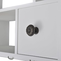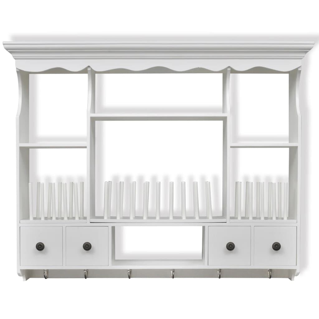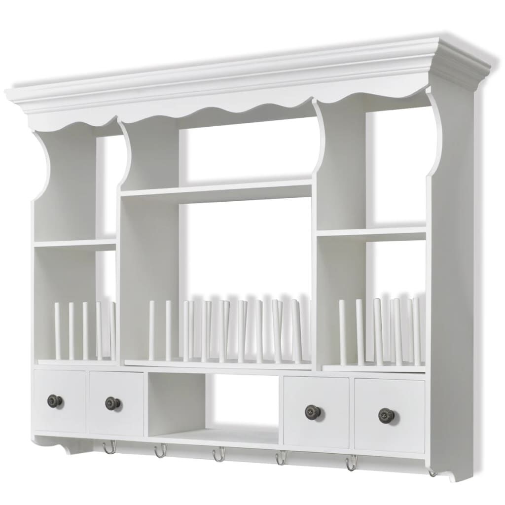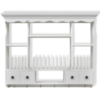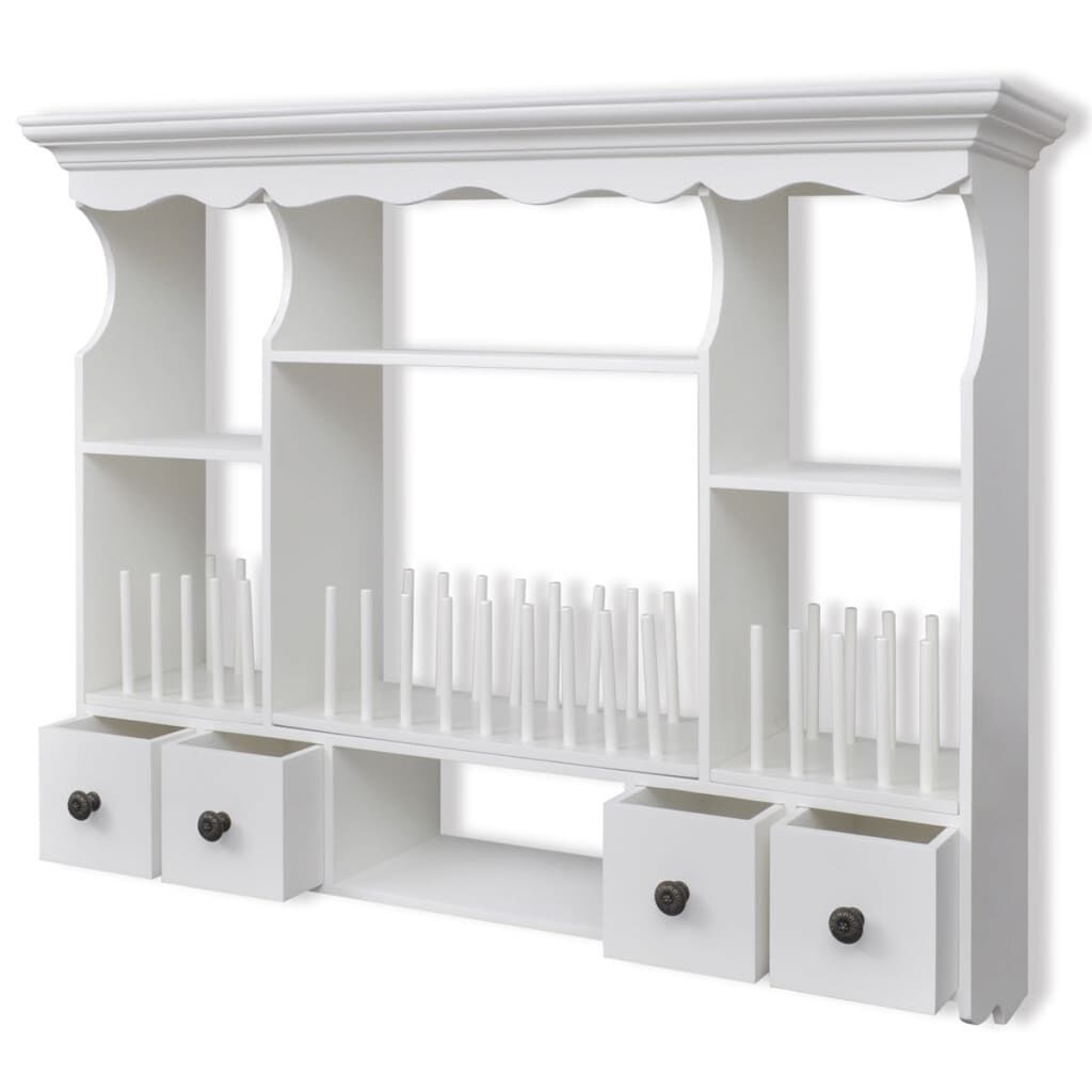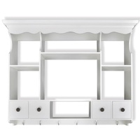 $341.09This elegant wooden wall cabinet in antique look offers plenty of storage and organisational options for virtually any kitchen, and will help to keep your kitchen neatly organised. The cabinet has four drawers and four shelves, allowing you to easily store cereal, spices, snack foods, canned goods and much more. The pegs keep your plates and dishes in place. The drawers are easily opened, so you can quickly get the things you need. It is equipped with hooks, for hanging mugs or towels. Made from high quality wood, this cabinet is designed to withstand a humid environment. The white paint finish makes it easy to clean with a damp cloth.