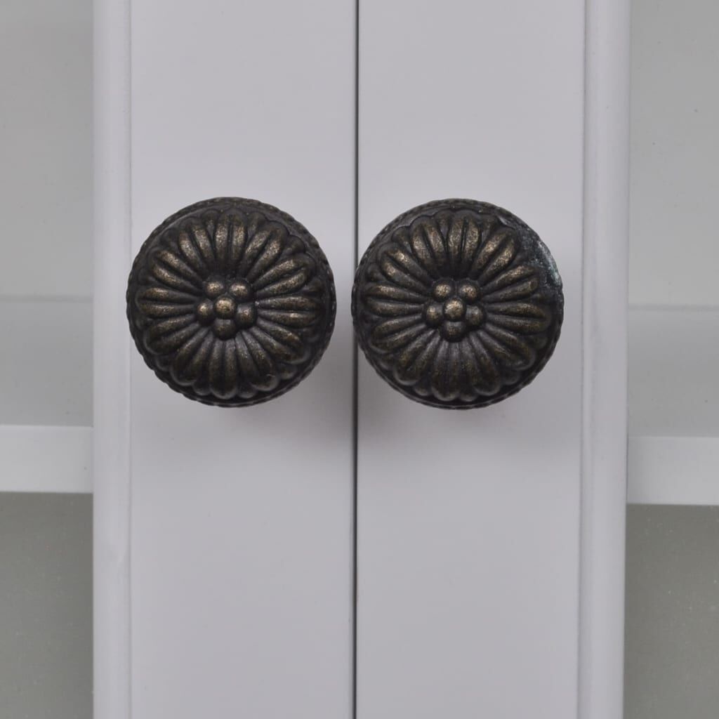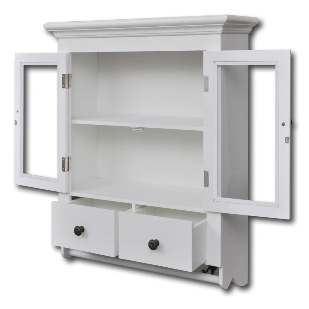 $260.09This elegant wooden wall cabinet in antique look will give you ample added storage space in the kitchen and will help to keep things organised. The cabinet has two drawers and two shelves, allowing you to easily store cereal, spices, snack foods, canned goods and more. It is equipped with 2 glass doors and 2 drawers that open easily, so you can quickly get the things you need. The hooks and pegs can be used for mugs or towels. Made of high quality wood, this cabinet is built to withstand a humid environment. The white paint finish makes it easy to clean with a damp cloth.