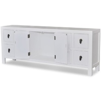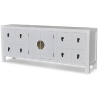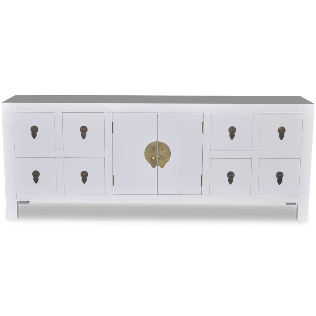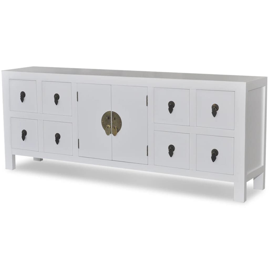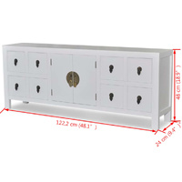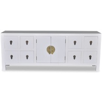 This wooden sideboard, with its classical Asian design, will be a great choice for organising and storing day-to-day items. It is also a great choice to be used as a TV cabinet. This unique sideboard/TV cabinet will make a great addition to your bedroom, study, or even hallway. This sideboard has 8 compartments for storing different types of items and trinkets. Constructed from high-quality MDF and pinewood with a white paint finish, this sideboard/TV cabinet is highly durable.