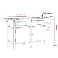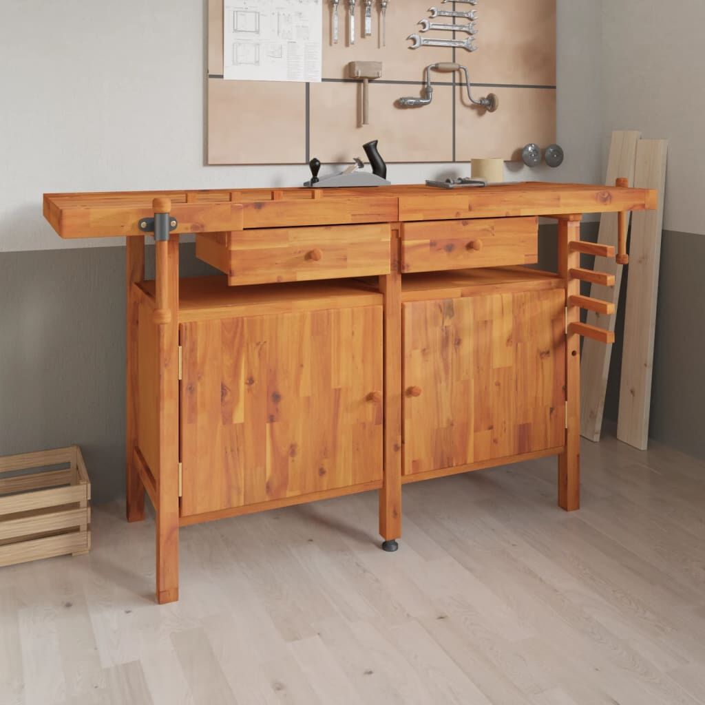 $518.39This wooden workbench is perfect for any job in the garage, workshop and shed, thanks to its strong and sturdy frame. Solid acacia wood: Solid acacia wood is a beautiful natural material. Acacia wood is a tropical hardwood, which is dense, sturdy, and durable.Additional sturdiness: The work table is equipped with 1 front vice and 1 end vice, including 4 wooden rods for fixing workpieces firmly and securely.Ample storage space: This work station, featuring 2 storage drawers and 1 large compartment with doors, provides ample storage space for keeping your tools well organised and within reach.Stable work surface: Thanks to the large and stable work surface, you can efficiently work on even larger workpieces. Warning:In order to prevent overturning, this product must be used with the wall attachment device provided. Note:The colours may vary from piece to piece, making each piece unique and slightly different from the next. The delivery is random, ensuring the exclusivity and individuality of your product.Each product comes with an assembly manual in the box for easy assembly.