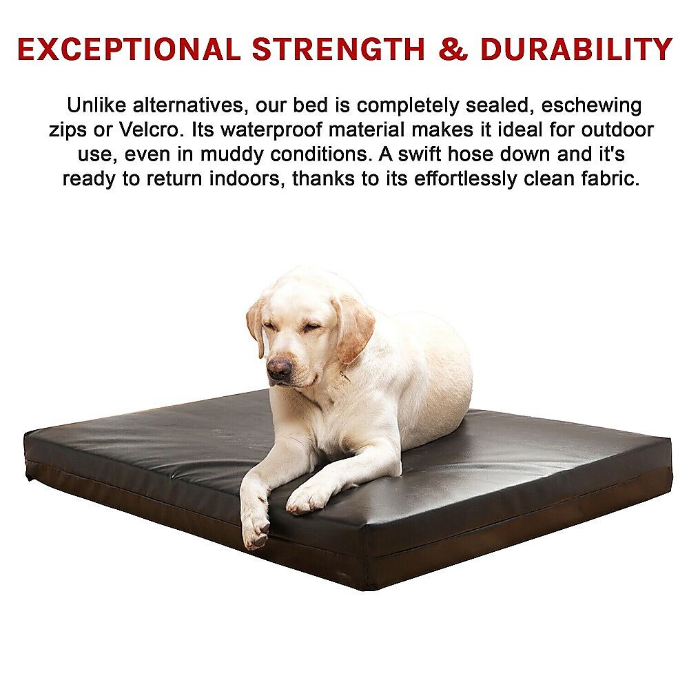 Measuring an XL size of 120 x 100 x 10cm and utilizing a specially coated nylon cover, our dog bed boasts exceptional strength and durability. Unlike alternatives, our bed is completely sealed, eschewing zips or Velcro. Its waterproof material makes it ideal for outdoor use, even in muddy conditions. A swift hose down and it's ready to return indoors, thanks to its effortlessly clean fabric.