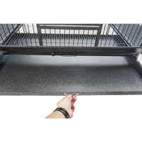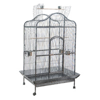 The birdcage is made of heavy-duty wrought Iron with a vein powder coated frame so it is tough and durable. The dimension of this cage is perfect for medium and large size birds and parrots. You can convert the cage to an open roof easily and let your bird perch up high. This brand new Open Top bird cage comes with seed skirts all around the cage, a large access door, side small access windows for stainless steel food/ water trays, 2 timber perches (one with 2 stainless steel feeders for the open roof), and removable tray for easy cleanup. The castor wheels are equipped on the matching stand provides great mobility.