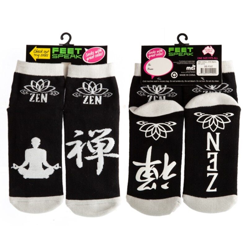 Black socks featuring a grey meditating silhouette zen Kanji