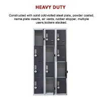 The unit has 12 individual locker compartments stacked in a 3 x 4 grid. Each locker provides ample space for personal items and can hold up to 30 kg. Built-in ventilations slits keep the stored items from smelling musty. Users may also customise their locker with a name tag or label in the designated slot provided. This comes comes with 4-digit combination lock to ensure safety of your belongings.