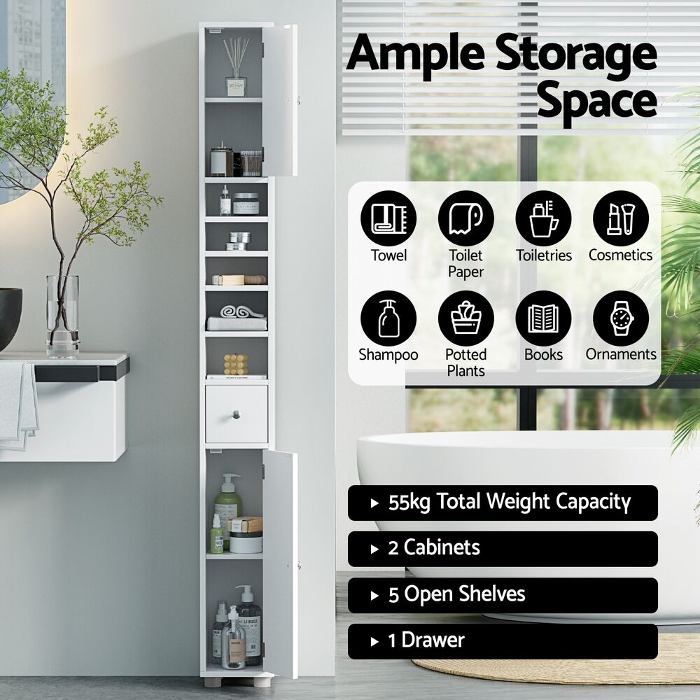 Maximise your space with the Artiss Storage Cabinet, a stylish and practical addition to any room. Its slim, vertical design fits effortlessly into tight spaces, while the ample storage includes two cabinets, five compartments, and a drawer to keep your essentials organised. The clean white finish blends seamlessly with most décor styles, adding a touch of elegance to your home. Designed for durability and convenience, the cabinet is made from sturdy MDF with a painted finish that's easy to maintain. It features adjustable shelves for versatile storage, magnetic doors with nickel handles for smooth operation, and an anti-toppling device for added safety. The elevated base enhances ventilation, making it suitable for bathrooms, bedrooms, and more.