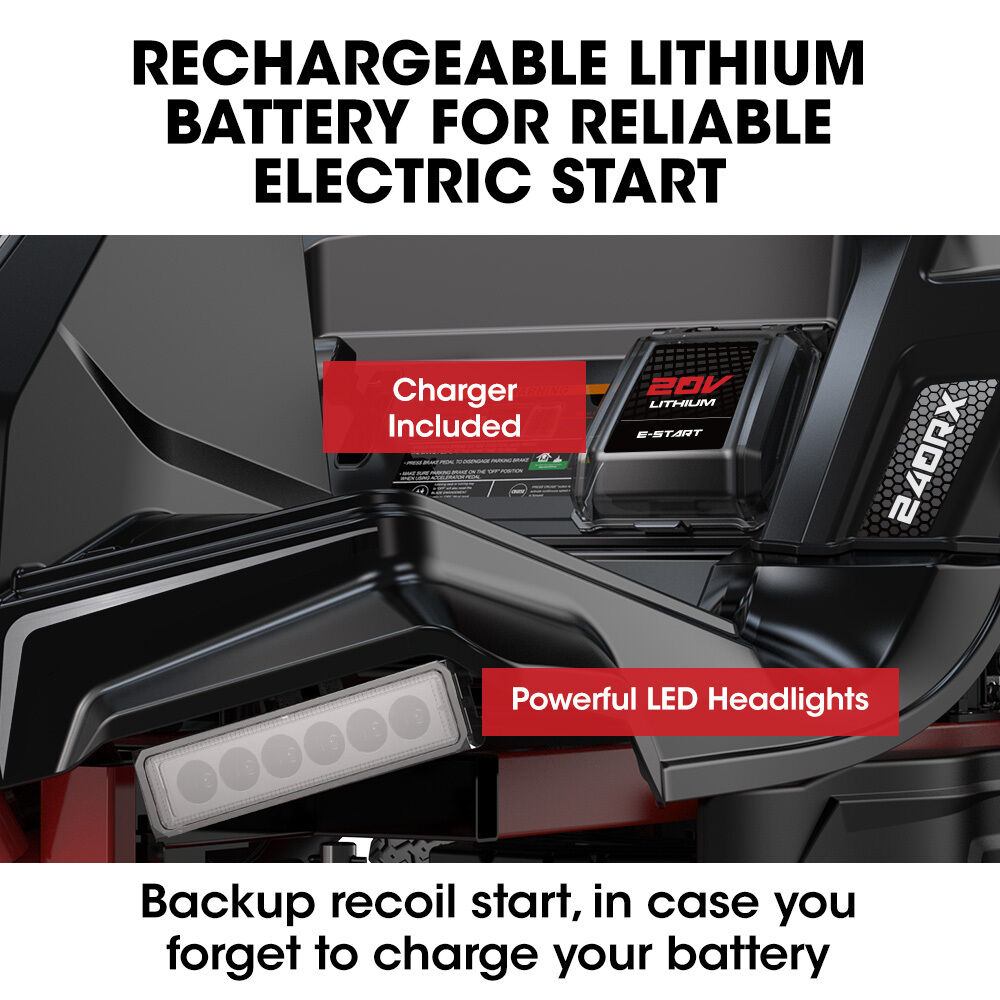 The Baumr-AG 240RX comes equipped with electric start technology. A rechargeable 20V Lithium battery maintenance-free is included. And just in case you forget to charge it, there is also a backup recoil pull start.