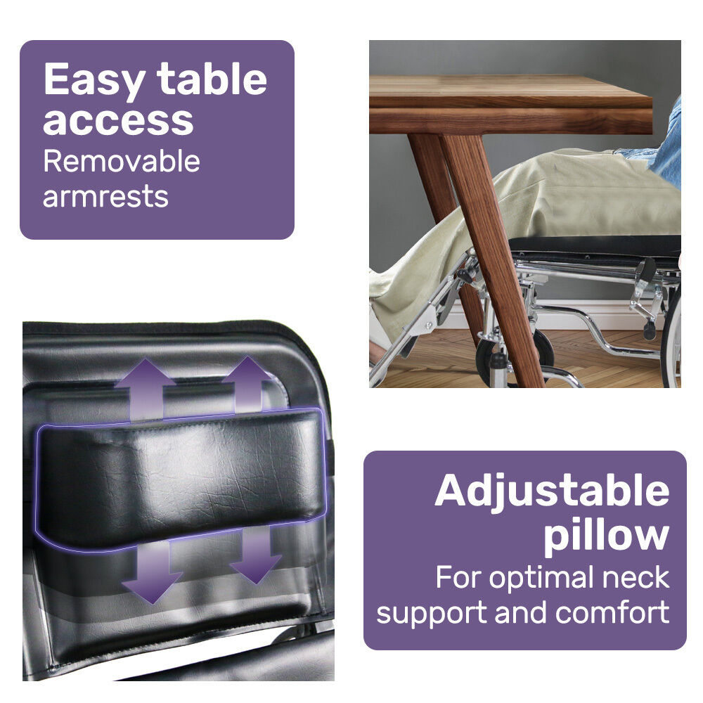 The backrest can be adjusted between 7 angles by a carer using the quick adjust handle levers. The fully reclining action offers several benefits, primarily related to comfort, pressure relief, and improved positioning for individuals who spend extended periods in a wheelchair.