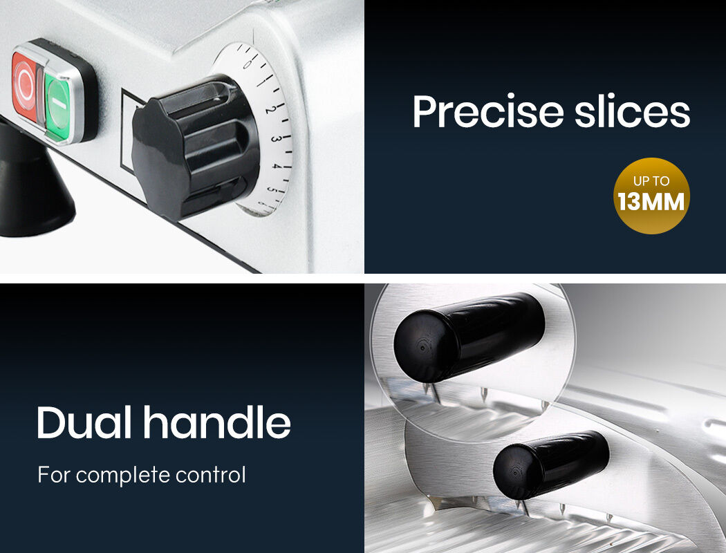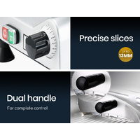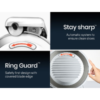 With a safety first design, fingers are shielded with the RingGuard™ system, and the large baffle serves a protective barrier. The solid base and non-slip feet also combine to deliver safe handling and control. The aluminium base is rust free and the entire unit is easy to keep clean. Precise thickness control lets you adjust from wafer-thin slices to 13mm cuts making it not only suitable for cold meats, but also for cheese, fruit and vegetables.