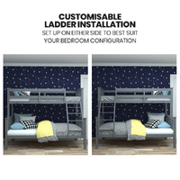 The Kingston Slumber Triple Bunk Bed Frame is crafted from solid high-quality sustainably sourced timber and is compatible with standard Australian single and double sized mattresses. Safety is paramount with SGS-certified quality, rigorously tested for superior durability. The bed features durable plywood slats and a solid, secure ladder. It even features an exclusive toy shelf which is sure to be a nice home for their favourites.
