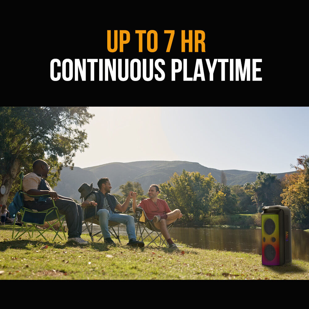 With 5-7 hours of battery life, seamless Bluetooth 5.3 connectivity, and True Wireless Stereo pairing allowing you to connect two of these, it’s always set for the next track or singalong. LED lights add the vibe, and it’s designed to go wherever you want to party.