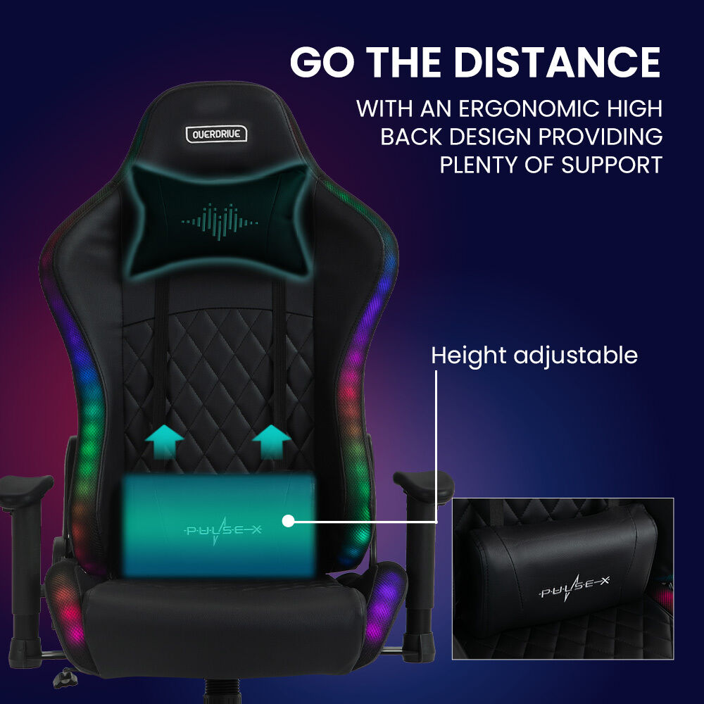 Level up your gaming with the Overdrive PulseX Gaming Chair for an immersive gaming experience. What sets the PulseX series apart is its premium comfortable design that features dynamic RGB LED lights and crisp built-in Bluetooth speakers.