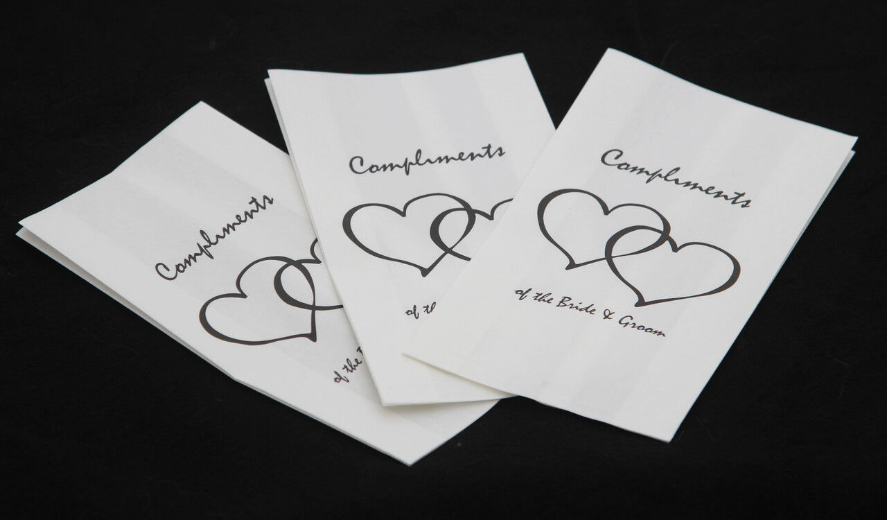 This pack includes 150 greaseproof wax paper bags, each adorned with an elegant heart design that complements a variety of wedding themes. Measuring 8 cm x 15 cm, these bags are the perfect size for packaging individual slices of your wedding cake.