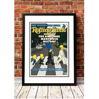 Celebrate the hilarious and iconic blend of The Beatles and The Simpsons with this high-quality framed 2002 Rolling Stone cover poster. Featuring the beloved Simpsons family in their parody of the legendary Abbey Road cover, this playful and unique piece is a must-have for fans of both classic rock and the long-running animated series.