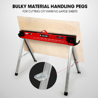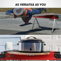 The legs are cross-braces for stability and feature support pegs that facilitate the cutting and marking of large sheet materials. Support arms on either end of the sawhorses can hold 2 x 4's in a horizontal position to form an ultra-sturdy jobsite table, and a non-slip surface on the top offers peace of mind. The support arms can also be shifted up vertically so that you can hold awkward material such as PVC pipes.