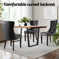 Elevate your dining space with this set of 4 Artiss Dining Chairs, designed to bring timeless charm to your home. Upholstered in your choice of PU leather or plush velvet, the chairs feature a button-tufted backrest and rivet edging for a sophisticated look. Crafted with a cushioned backrest filled with high-resilience foam, these chairs provide exceptional comfort during meals and gatherings. The rubberwood legs ensure reliable support, while anti-slip feet protect your floors. Perfectly blending style and practicality, these dining chairs make a stunning addition to any dining room.