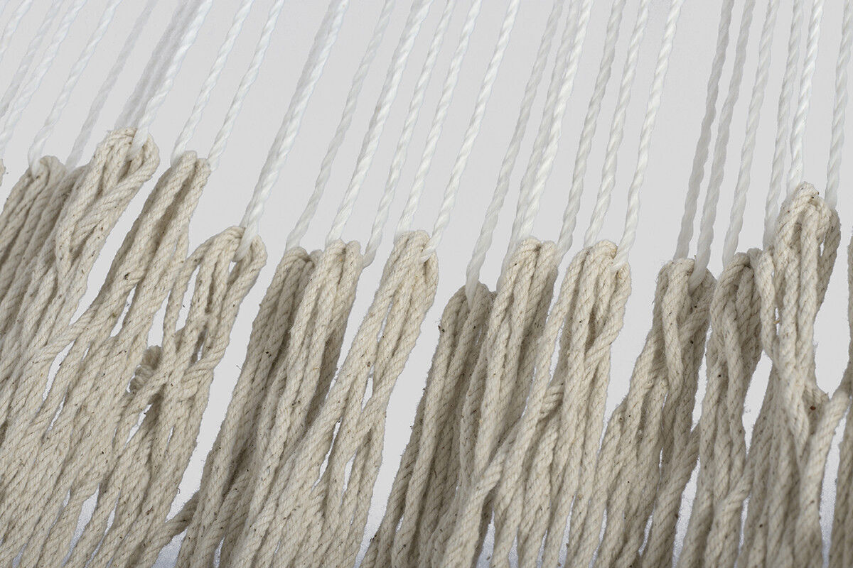 Indulge in relaxation with this luxurious, spacious ivory hammock. Hand-woven by skilled Mayan Legacy artists using high-quality cotton rope, it promises to elevate your leisure time. Its elegant design and generous size, complete with long, luxurious fringe on both sides, offer the perfect setting for unwinding. Simply add a pair of straps or a frame to set it up and enjoy its comfort. Made with love and care in Mexico.