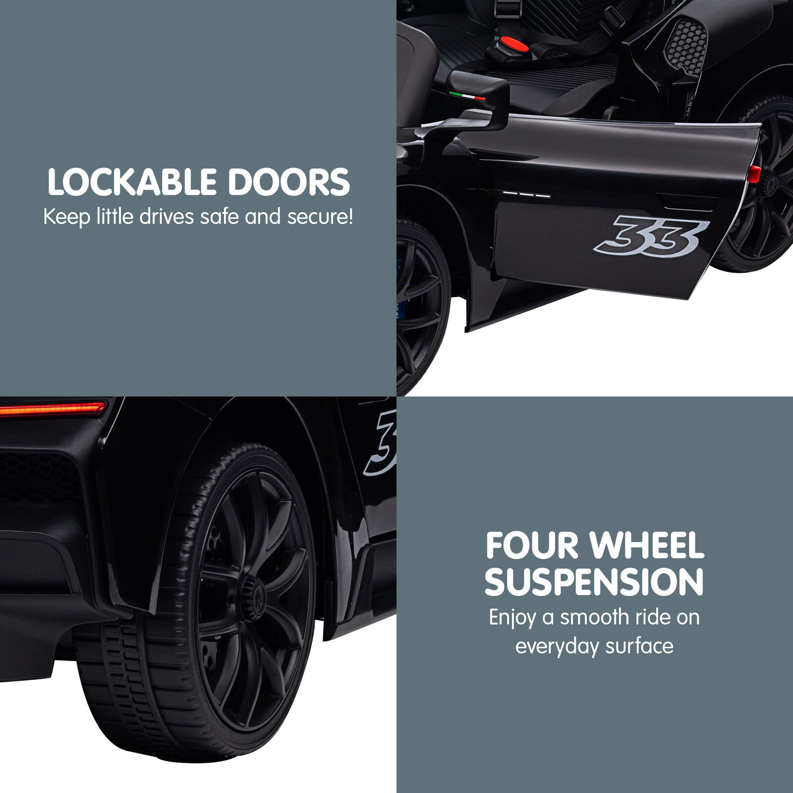 The interactive dashboard is packed with fun features like MP3, Bluetooth, USB, AUX, a mode switch and a power display for non-stop entertainment. Parents can easily take the wheel with the 2.4G remote, while kids get to enjoy smooth starts, forward and backward driving and adjustable speed settings. Its the perfect ride for your little racer!