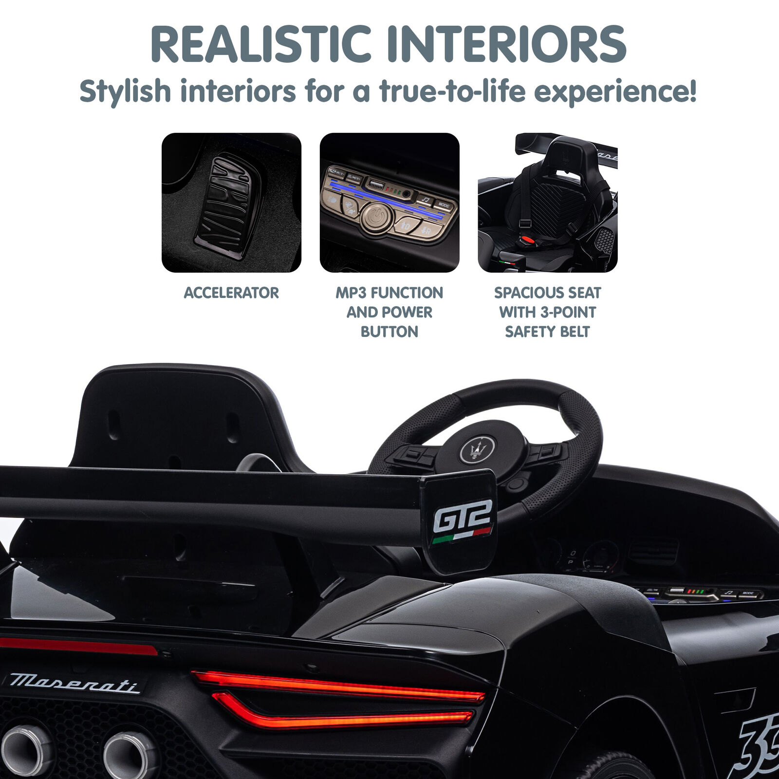 Unleash the thrill of luxury driving for your little racer with this officially licensed Maserati MC20 GT2 ride-on car! Its powered by dual motors that can hit speeds of 35 km/h, plus functional doors, LED lights and a three-point safety belt to keep things exciting but safe.