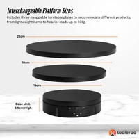 Tooleroo 3-in-1 Electric Rotating Display Stand – Elevate your product presentations with this 360° motorised turntable, designed for photography, videography, and retail displays. Featuring adjustable speeds, three interchangeable platform sizes, and multiple rotation angles, this quiet, USB-powered display stand comes with the option of using a rechargeable battery, and is perfect for showcasing jewellery, electronics, cakes, and more. Remote-controlled for effortless operation, it supports up to 10kg and ensures smooth, stable rotation—ideal for professional merchandising and content creation.