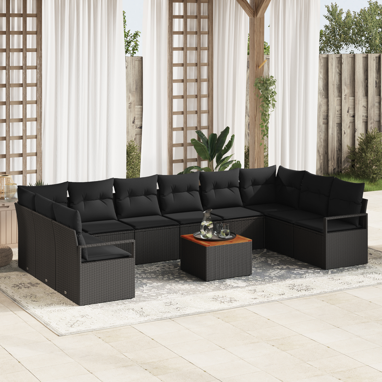 11 Piece Garden Sofa Set with Cushions Black Poly Rattan Acacia