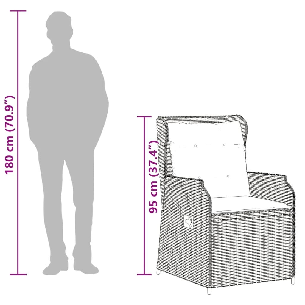 Relax and enjoy the outdoors in these comfortable reclining garden chairs! Durable material: PE rattan, also known as poly rattan, is a strong, low-maintenance synthetic material that looks like natural rattan. It's lightweight, easy to clean, and commonly used for outdoor furniture due to its durability and weather-resistant properties.Adjustable backrest: This garden furniture has a handle on the right side. You can adjust the backrest to any position by pulling the handle. You can also quickly return the backrest to its original position with the handle.Comfortable seat experience: This outdoor furniture, complete with thickly padded cushions, offers a comfortable seating experience.Removable and washable cover: These seat cushions feature removable covers for easy washing and maintenance.Robust and stable frame: The powder-coated steel frame ensures the garden furniture is strong and stable for daily outdoor use. Good to know:To make sure your outdoor furniture stays beautiful, we recommend protecting it with a waterproof cover.